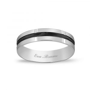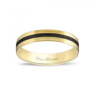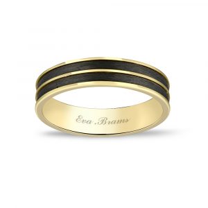 Une bague moderne en or 18K, avec deux bandes de carbone, symbolisant l'équilibre entre lumière et obscurité. Disponible en Or 18K.