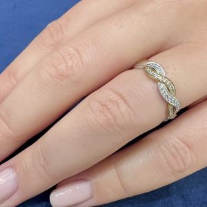 Une bague élégante en or 18K, avec un design croisé et des diamants scintillants, alliant modernité et raffinement.