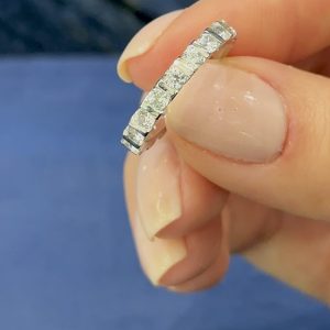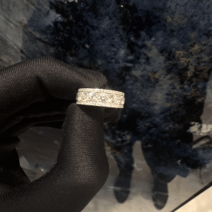 Cette alliance tour complète se distingue par son ajourage raffiné, laissant la lumière circuler librement sous chaque pierre. Une structure légère et lumineuse qui sublime l'éclat des diamants tout en offrant un confort exceptionnel.