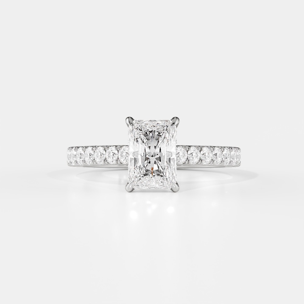 L’Éclat Secret en Taille Radiant unité la puissance du feu et la pureté des lignes. Son centre, un Diamant à la géométrie éclatée, est serti de 4 griffes délicates pour révéler chaque reflet. Ses facettes multiples diffusent la lumière avec intensité, tandis que l’anneau pavé prolonge ce scintillement dans une continuité parfaite.