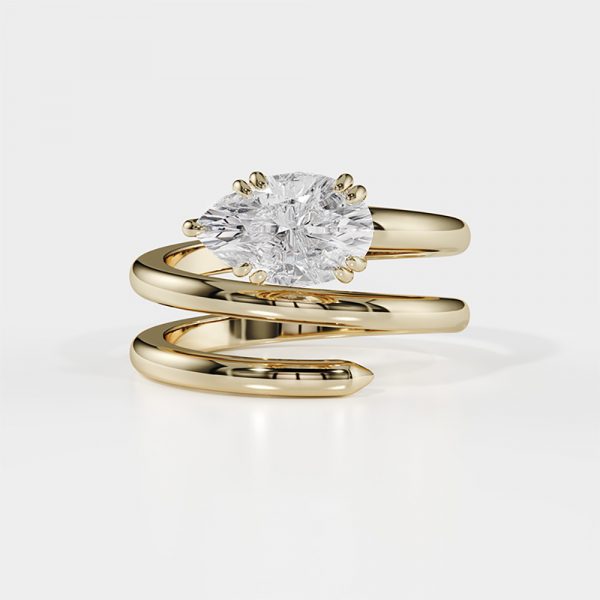 Le diamant taille poire apparaît comme suspendu au sommet de cette spirale précieuse, captant la lumière avec intensité.