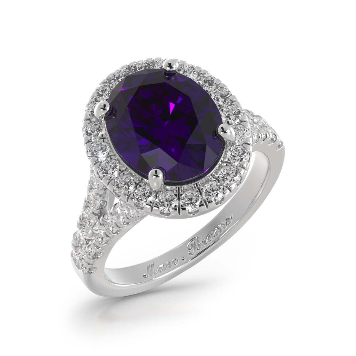 La bague L’Améthyste Royale est sublimée par une somptueuse Améthyste ovale, entourée d’un éclatant pavage de Diamants. Réalisée en Or 18 k ou en Platine, cette création d’exception allie élégance et raffinement.