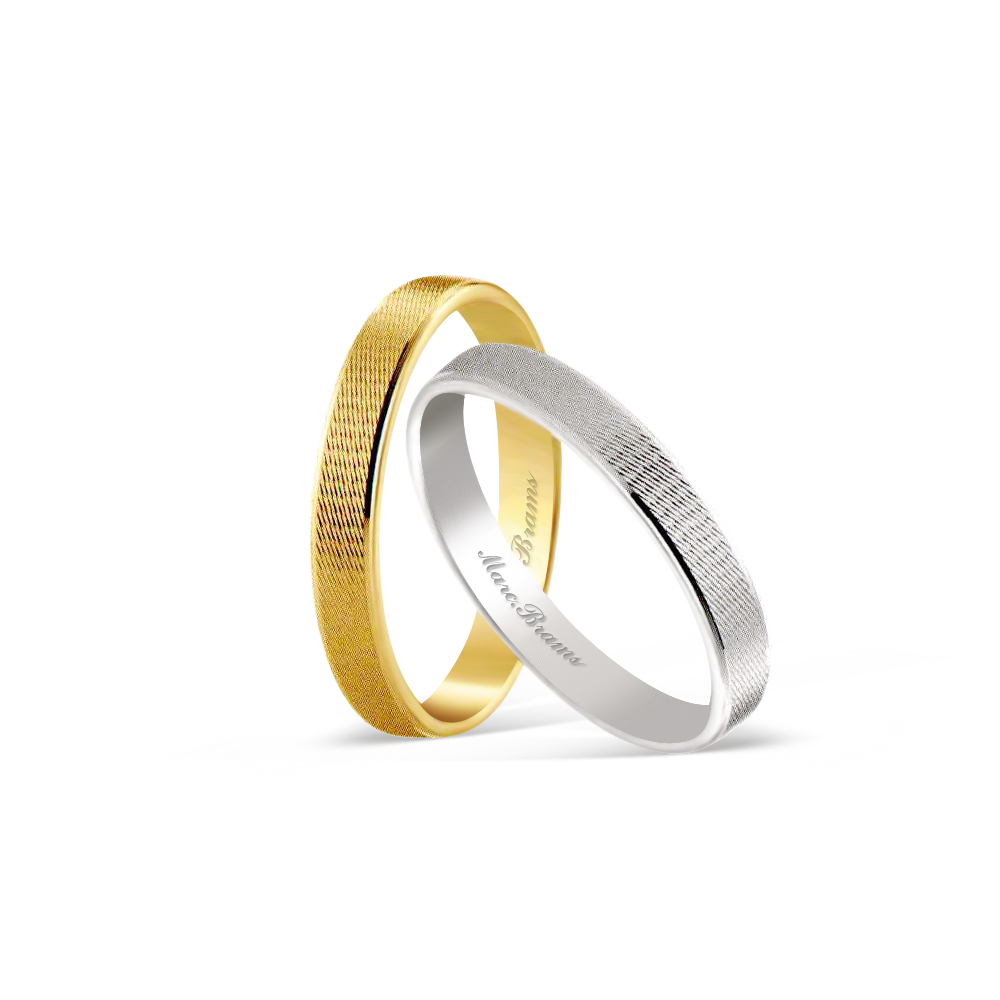 L’alliance “Ondes d’Or” se distingue par sa texture délicatement striée, rappelant les douces ondulations de l’eau. Ce motif raffiné crée un jeu de lumière subtil, conférant à cette création une élégance intemporelle et moderne.
